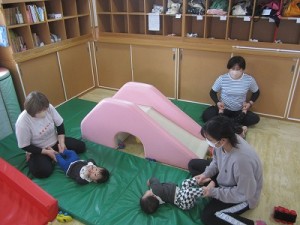 初めての赤ちゃん体操で、泣いてしまうお友達は抱っこで参加しましたが、気に入って笑ってくれるお友達もいました♫